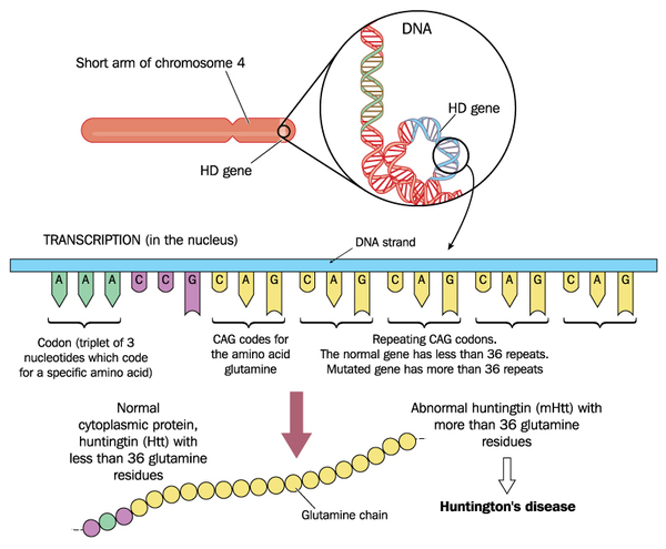 The HTT variant that causes Huntington's disease involves a DNA segment known as a CAG trinucleotide repeat. This segment is made up of a series of three DNA building blocks (cytosine, adenine, and guanine) that appear multiple times in a row. Normally, the CAG segment is repeated 10 to 35 times within the gene. In people with Huntington's disease, the CAG segment is repeated 36 to more than 120 times. People with 36 to 39 CAG repeats may or may not develop the signs and symptoms of Huntington's disease, while people with 40 or more repeats almost always develop the disorder.